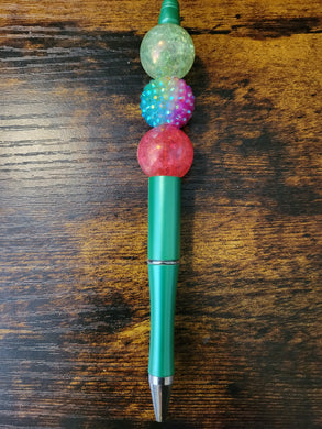 Metallic green w/ crackle green, pastel rhinestone, crackle pink - Beaded Pen